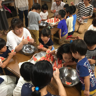 一歩一歩ゲームで大はしゃぎ! スイカ割りー! みんなで食べるとおいしいね。